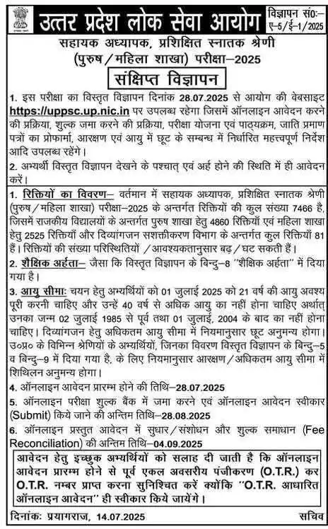 UPPSC released notification for lt grade assistant teacher vacancy for the post 7466. Candidate can apply for this vacancy from 28 July 2025. Candidate was waiting for this vacancy from a long time now its out so read notification carefully and apply.
